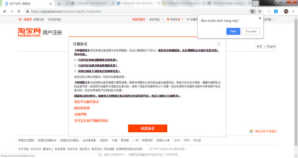 + Bạn truy cập vào đường link http://reg.taobao.com/member/reg/fill_mobile.htm để đăng ký tài khoản, sau đó đồng ý các điều khoản để thực hiện các bước mua hàng tiếp theo trên Taobao.