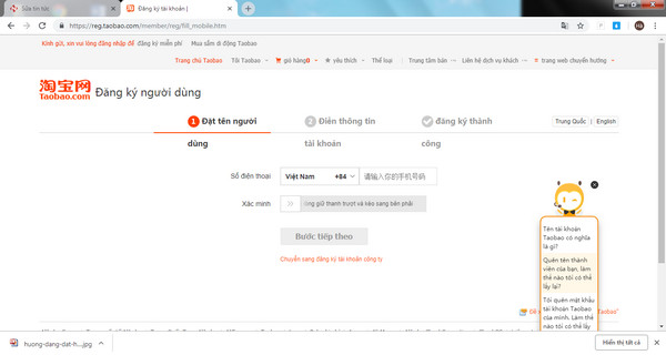 + Sau khi đã xác nhận số điện thoại, màn hình sẽ hiện ra một cửa sổ mới, bạn điền đầy đủ các thông tin gồm: tên đăng nhập, đặt mật khẩu và xác nhận lại mật khẩu, mật khẩu gồm cả chữ và số có độ dài từ 6-20 ký tự. Hoàn thành đầy đủ các bước trên, bạn đã có tài khoản trên Taobao và nhập hàng Taobao như thường.
