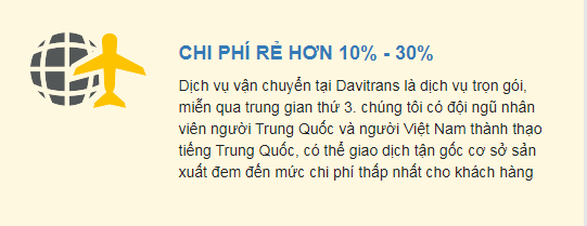 Không chỉ đảm bảo tiêu chí chất lượng, Davitrans còn ghi điểm với khách hàng bởi chi phí vận chuyển rẻ hơn thị trường 30% bởi áp dụng máy móc hiện đại, sẵ có cộng với mối quan hệ lâu năm với các đối tác hay hải quan, giúp thương lượng giá cả và giảm thiểu các chi phí thông quan, giúp khách hàng tiết kiệm được một khoản chi phí khi lựa chọn đơn vị ship hàng hộ này.