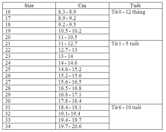 Bảng size giày trẻ em trung quốc này có thế sử dụng cho các bé từ 1 tháng tuổi đến 10 tuổi. Các mẹ có nhu cầu order hàng thì cần lưu ý vấn đề chọn size giày để bé đi được thoải mái và dễ chịu nhất.